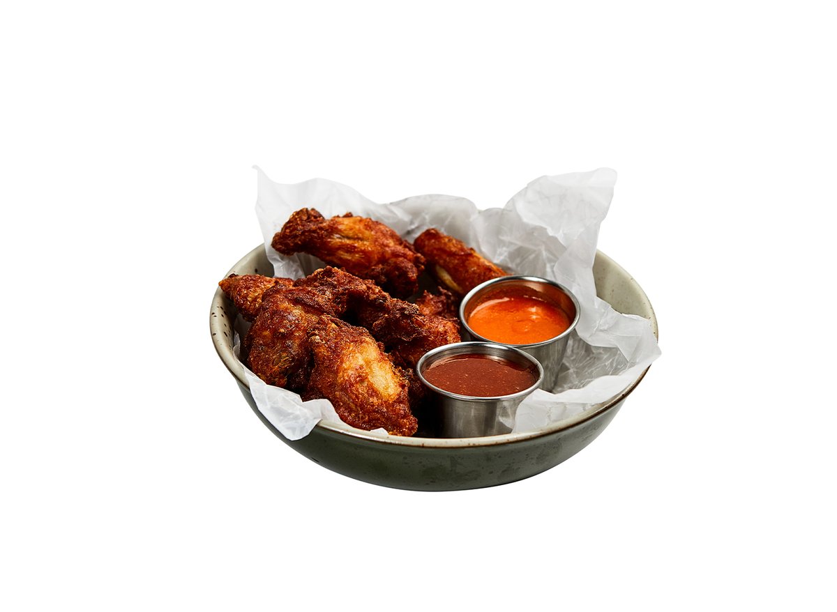 Krõbedad kanatiivad. Serveeritakse aprikoosi- ja vürtsika buffalo kastmega