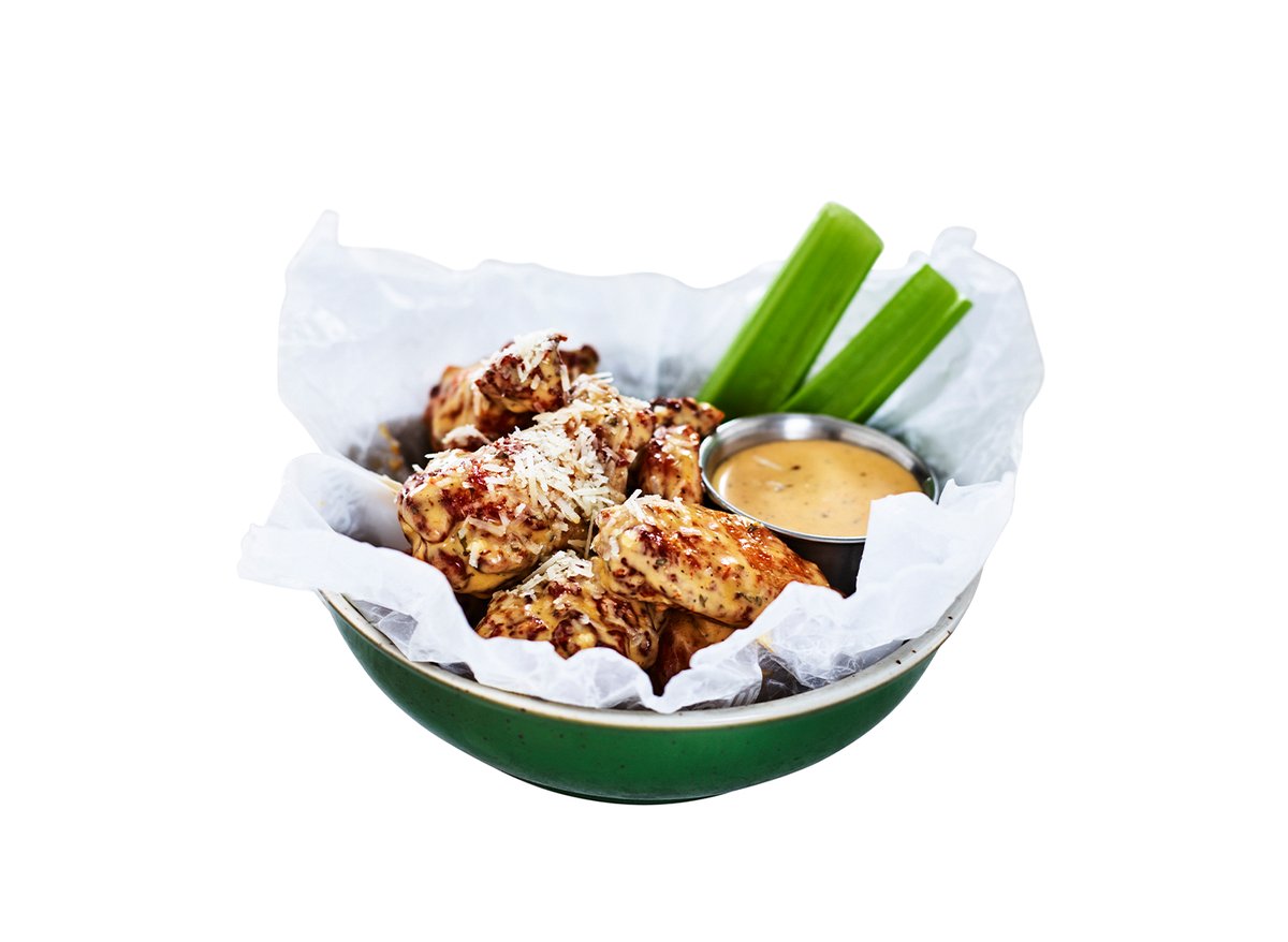 Krõbedad kanatiivad maitsestatud kreemja parmesani-küüslaugu- kastmega. Serveeritakse selleri ja riivjuustuga.