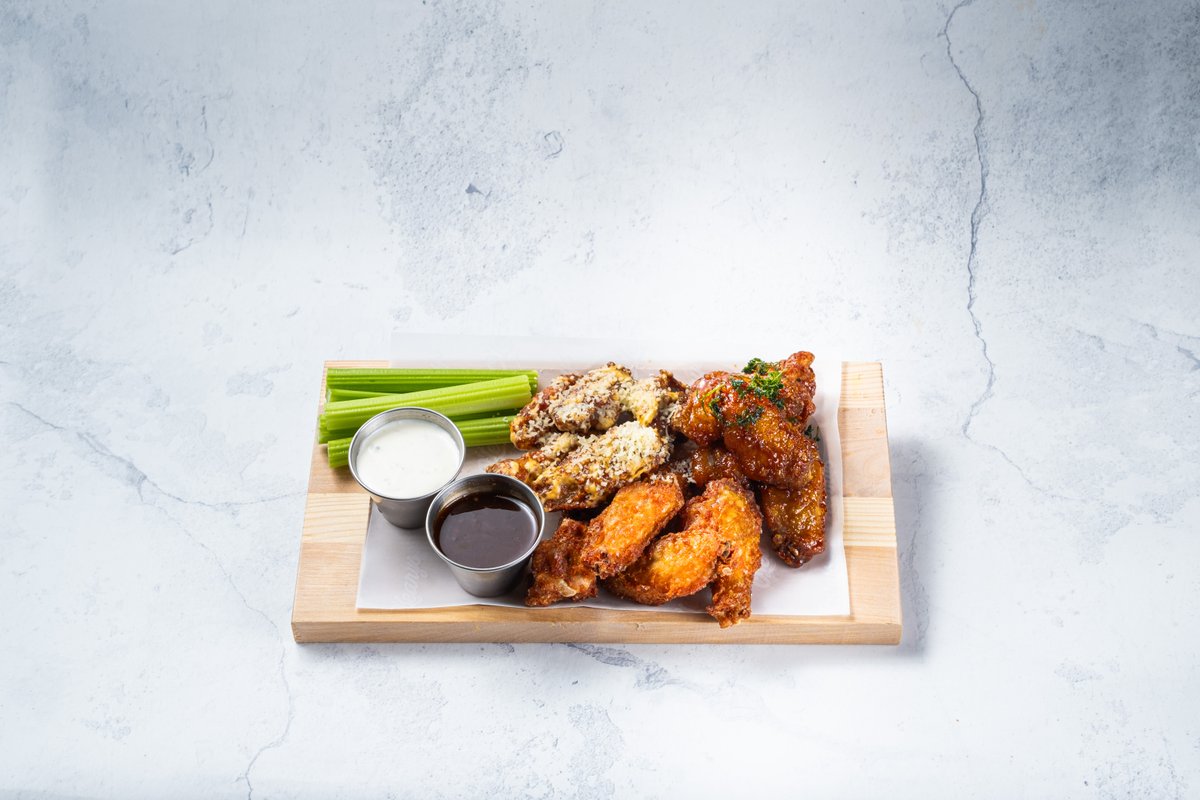 Krõbedad tiivad, vürtsikad Buffalo tiivad, parmesani ja küüslauguga, serveeritud sinihallitusjuustu ja Buffalo kastmega ning värskete selleripulkadega.