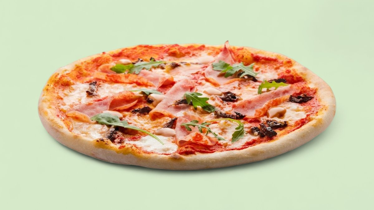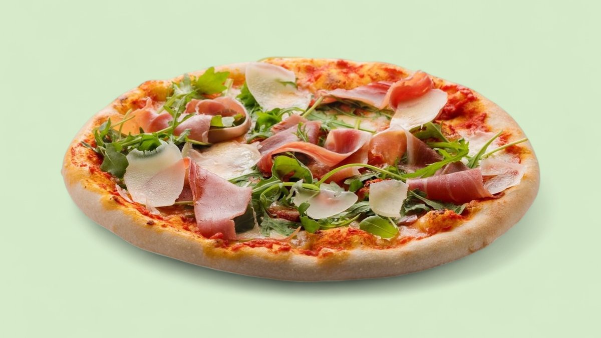 Tomatikaste, mozzarella, prosciutto sink, kõvajuust, rukola, isetehtud pestokaste.