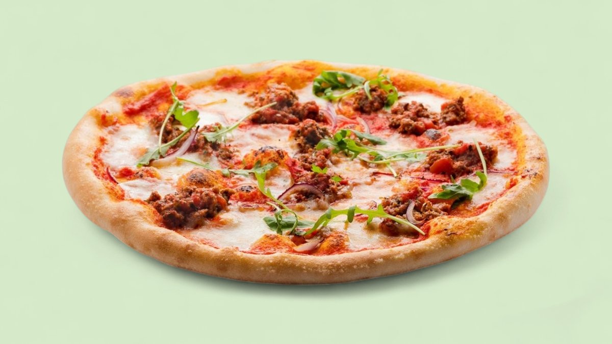 Tomatikaste, mozzarella, hakkliha, punane sibul, rukola.