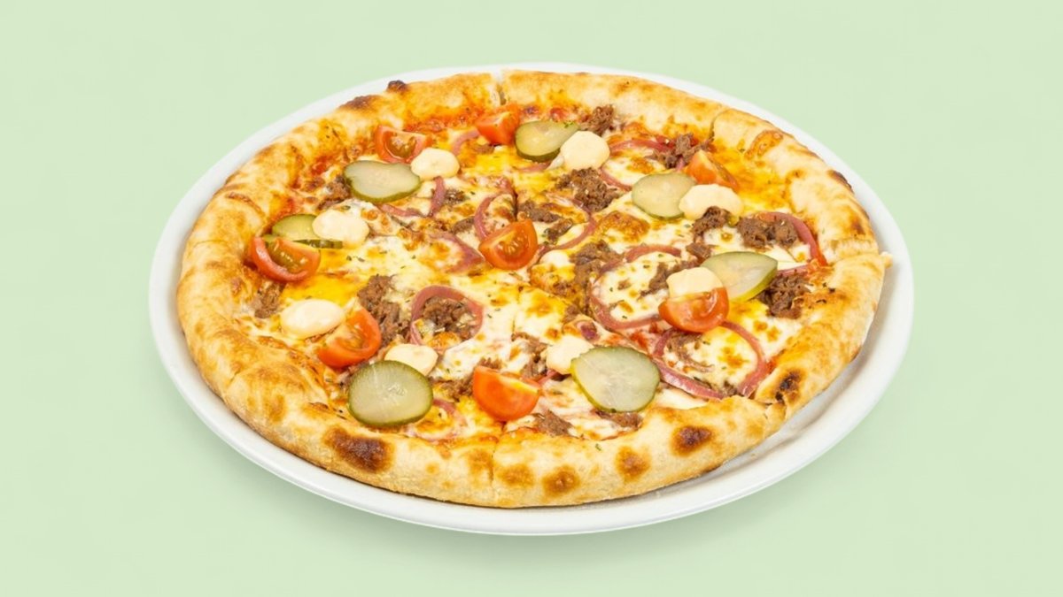 Burger veiseliha, hamburgerikastme, 2 x Cheddari juustu, praesibula, lehtsalati ja marineeritud kurgiga. Serveeritakse marineeritud kurgi ja friikatega