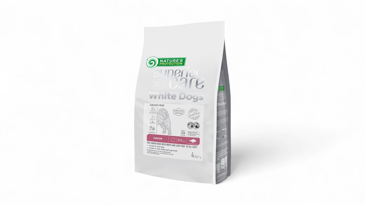 NATURE’S PROTECTION SUPERIOR CARE White Dogs Grain Free White Fish Junior All Sizes, kuivtoit teraviljata valge kalaga kasvavatele valgekarvalistele igas suuruses koertele, 4 kg