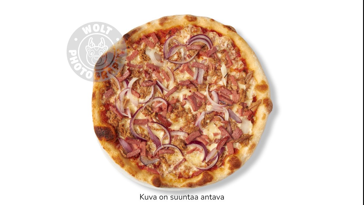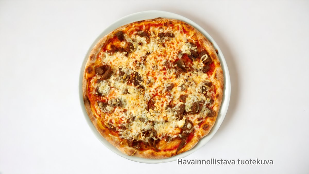 Tomaattikastike, kebab, edamjuusto, sipuli, tomaatti (sisään leivottu)