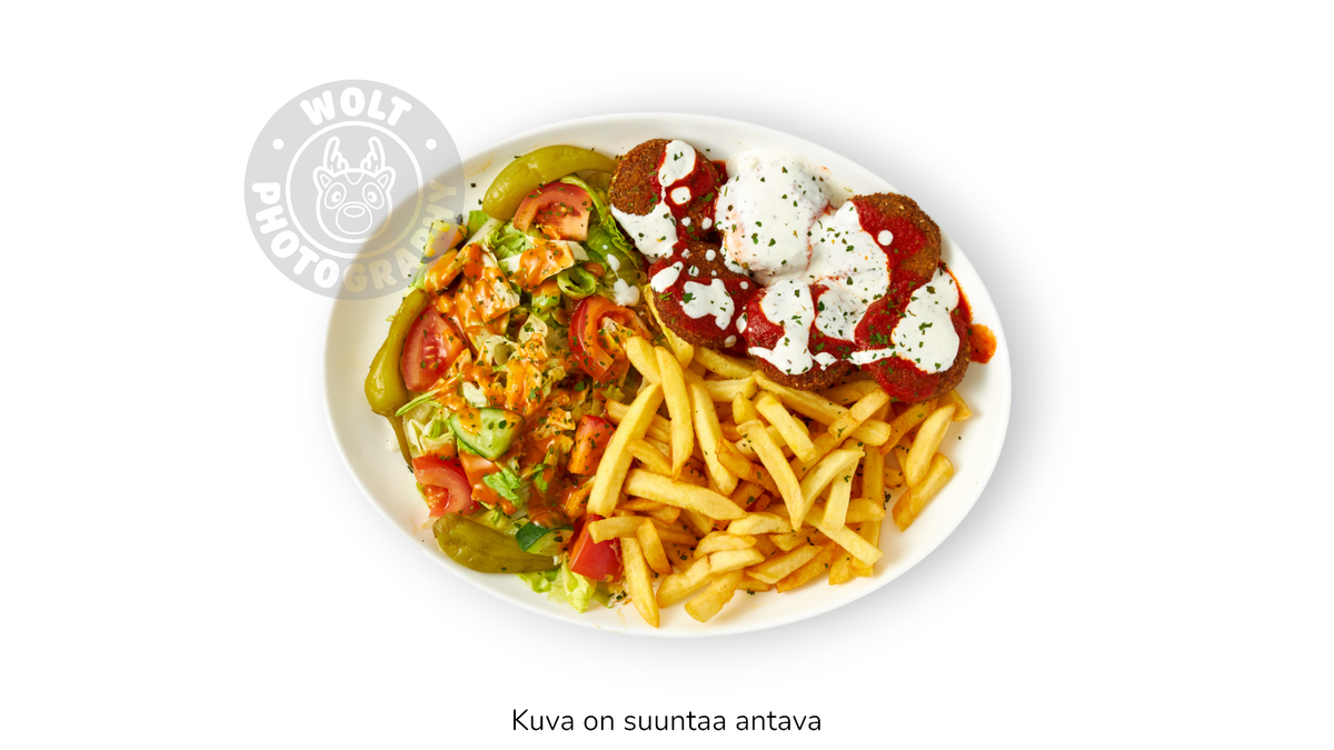 Annoksiin (ei calzone) sisältyy salaatti, kurkku, tomaatti, jogurttikastike, kebabkastike, salaattikastike.