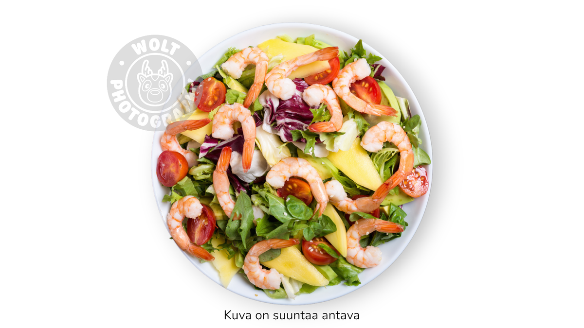 Maukas salaatti, jossa on katkarapuja sekä sekoitus tuoreita vihanneksia.