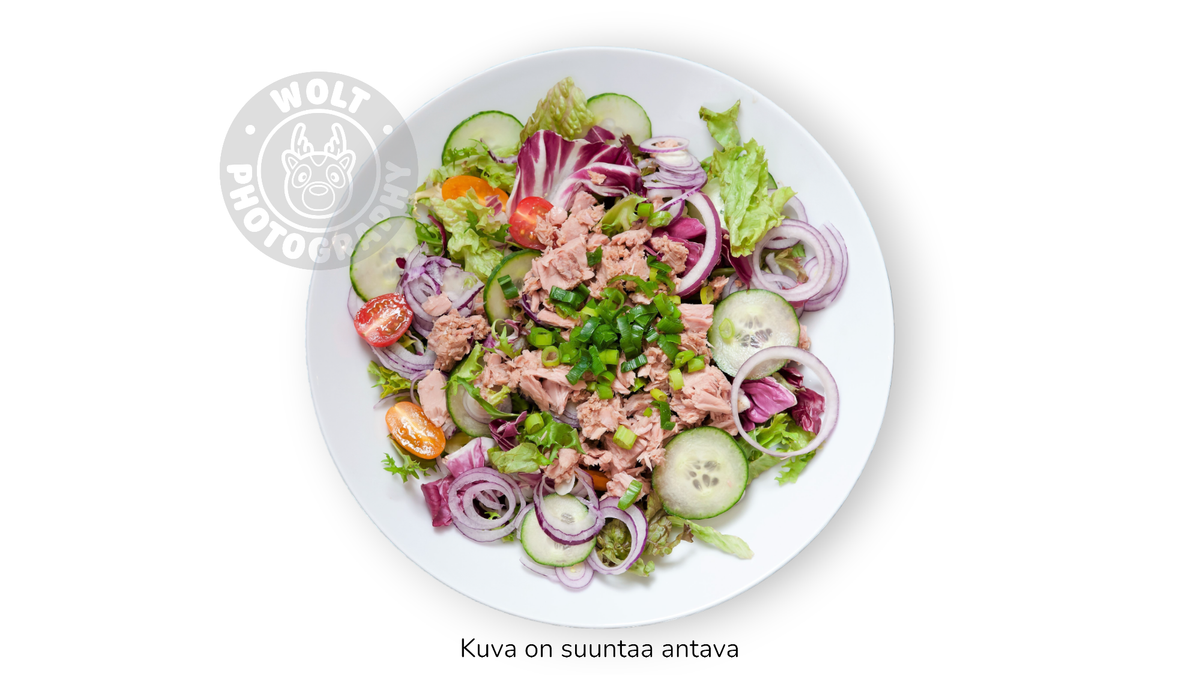 Raikas salaatti tonnikalalla, kasviksilla ja kastikkeella.