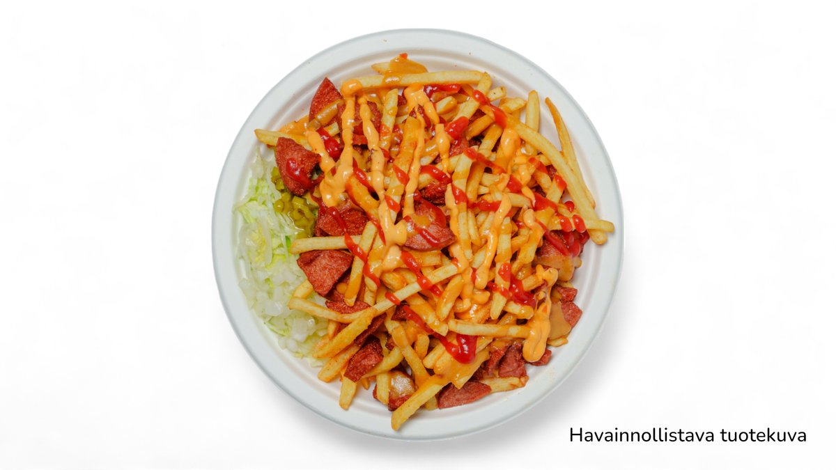 Ranskanperunat, suolakurkku, sipuli, ketsuppi, sinappi