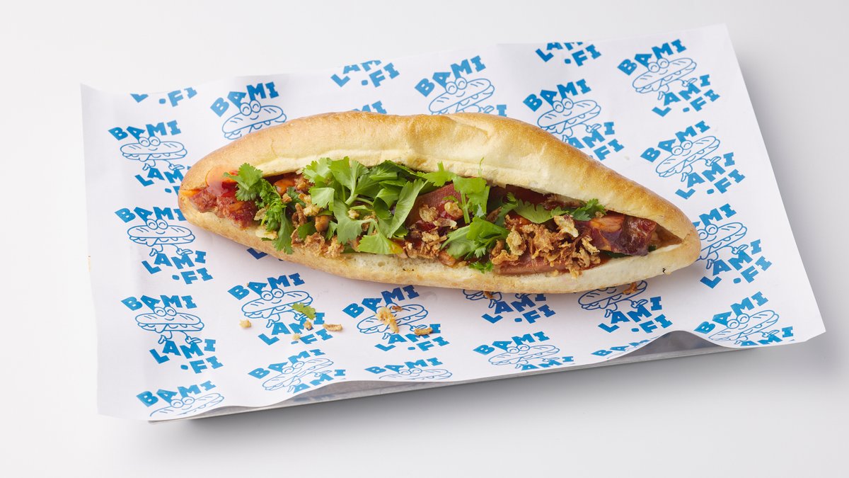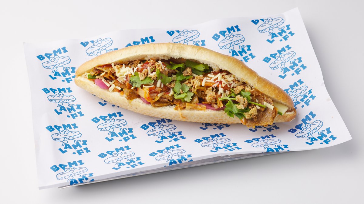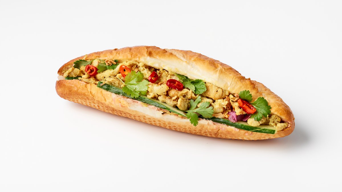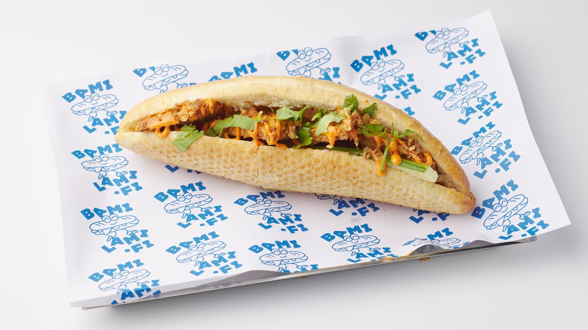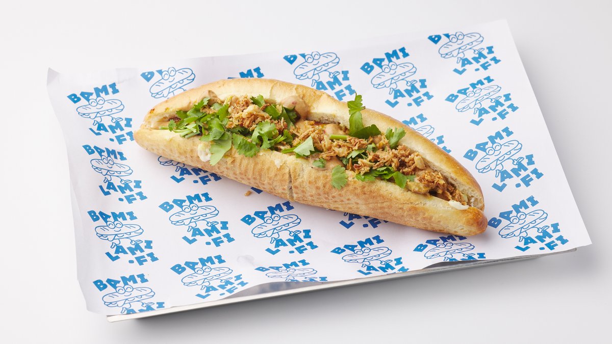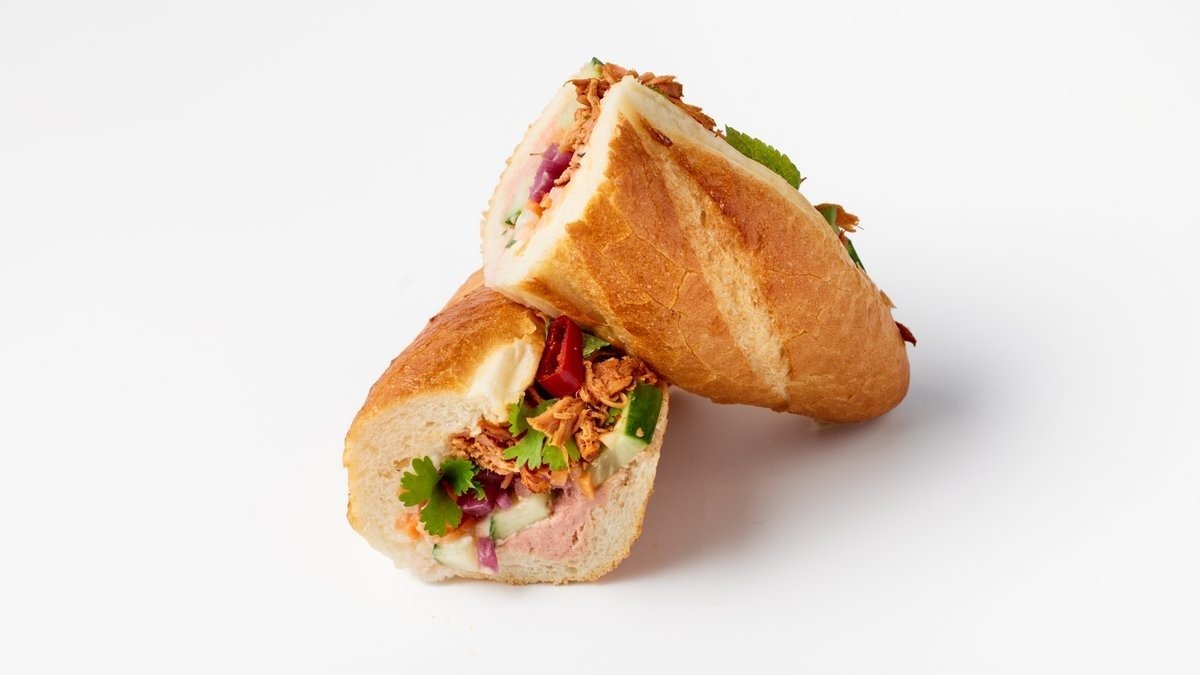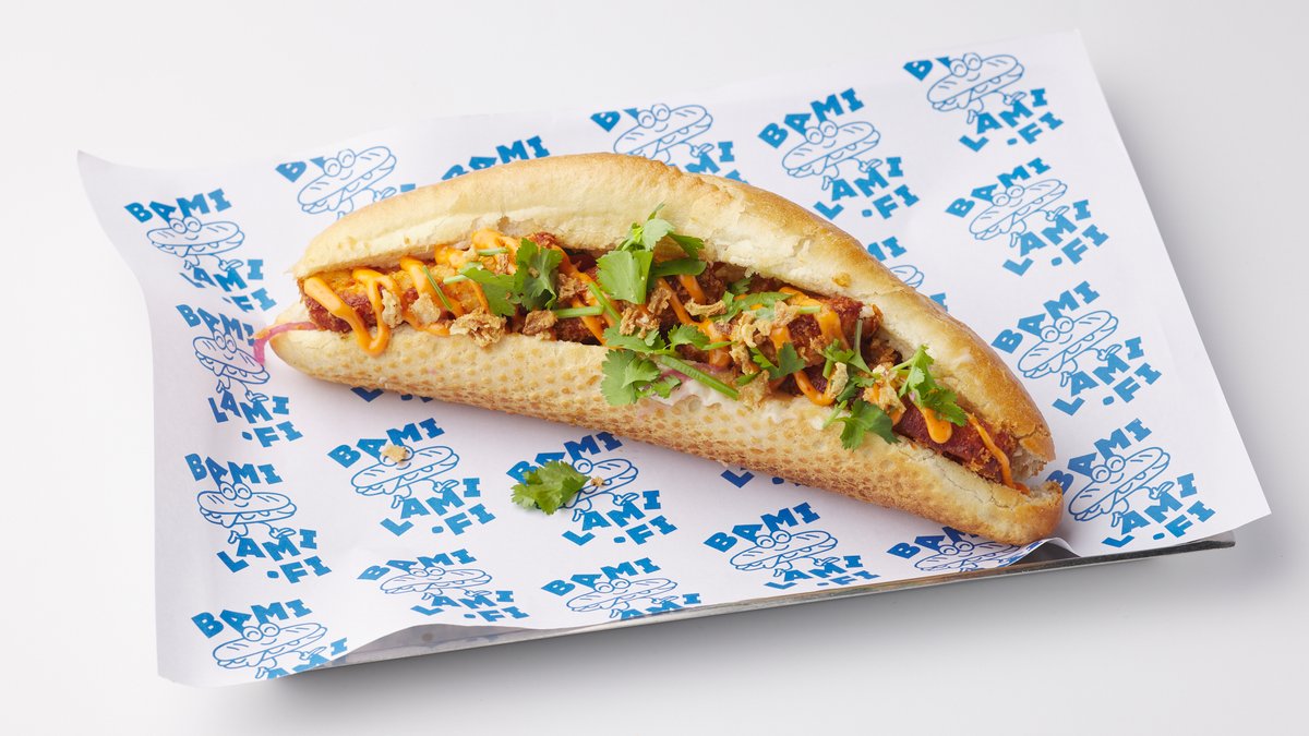 Vegaaninen majoneesi, possu pate, pikkelöity porkkana & retiisi, pikkelöity punasipuli, korianteri minttu ja paahdettu sipulirouhe (sisältää gluteenia). Origin of the meat: Pork: Finland Chicken: Finland Beef: EU