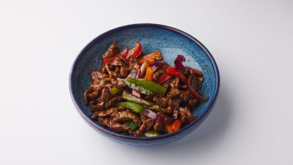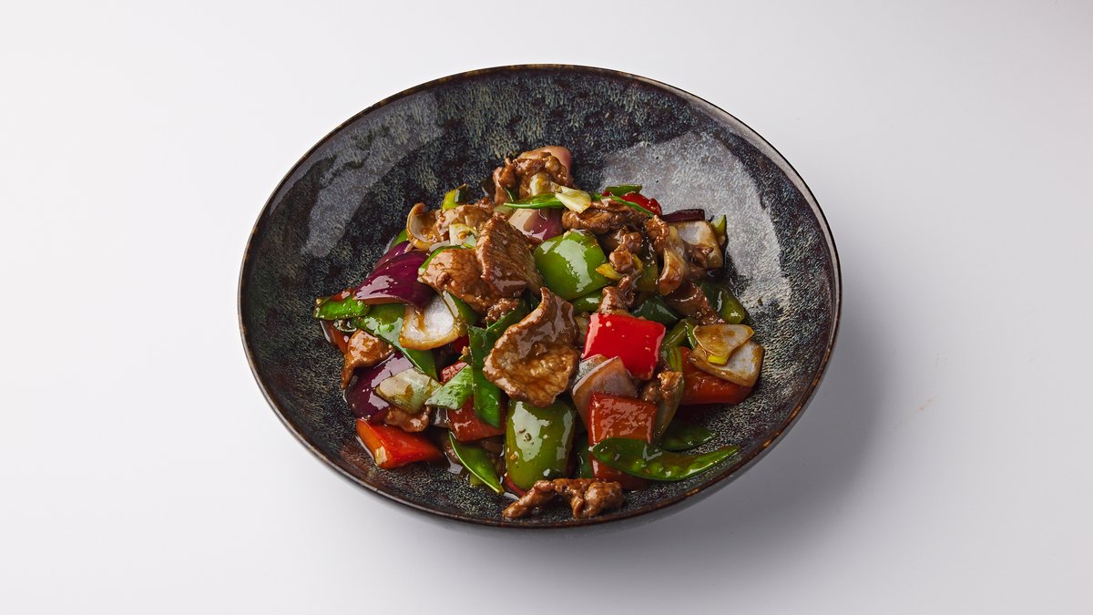 Beef, red onion and carrot with black pepper sauce