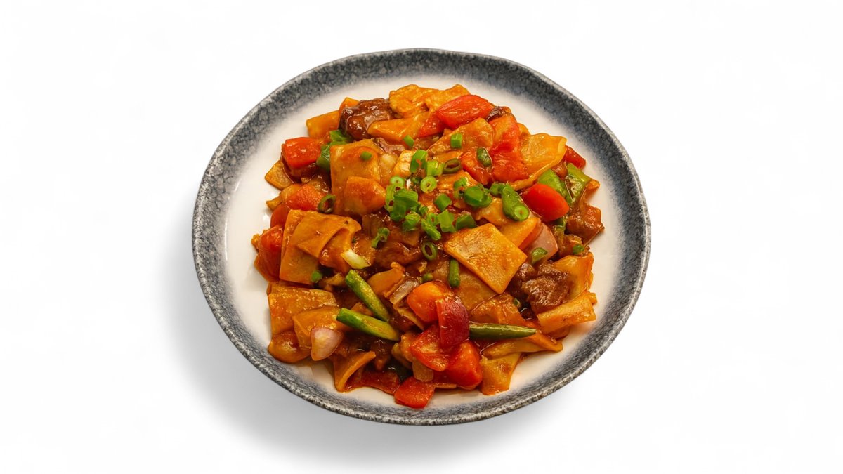 Biang Biang noodle pieces, lamb, tomato and garlic shoot in tomato sauce
