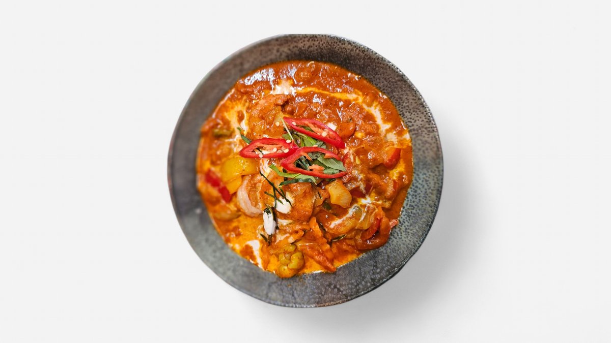 Paistettuja katkarapuja, punaista currya, vihanneksia ja kookosmaitoa