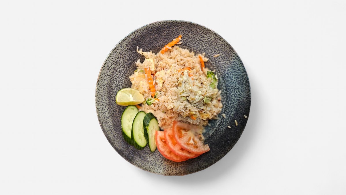 Paistettua riisiä, vihanneksia, kananmunaa ja tofua
