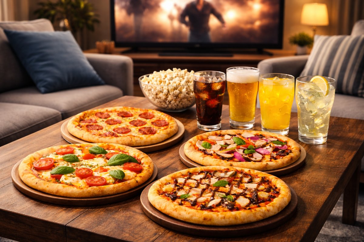 Täydellinen paketti jaettavaksi! 4 herkullista pizzaa ja 4 juomaa vain 49.90€. Loistava valinta perheelle tai kaveriporukalle.