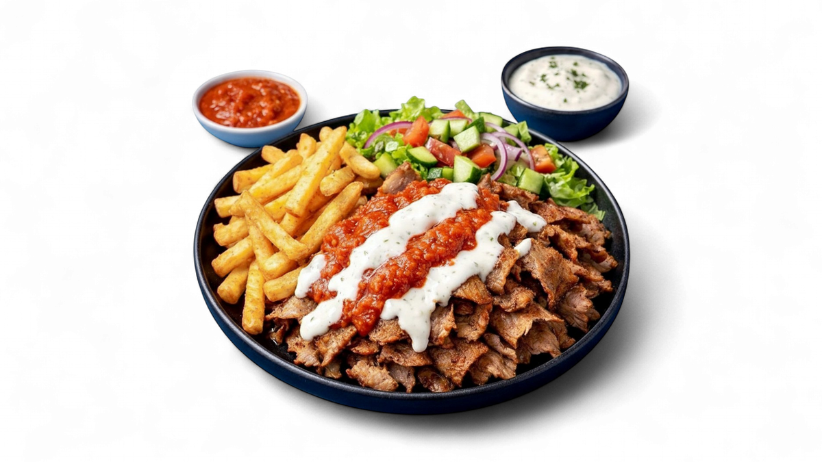 Mehukas kebabliha, rapeat ranskalaiset ja raikas salaatti. Viimeistelty mausteisella tomaattikastikkeella ja pehmeällä jogurttikastikkeella.