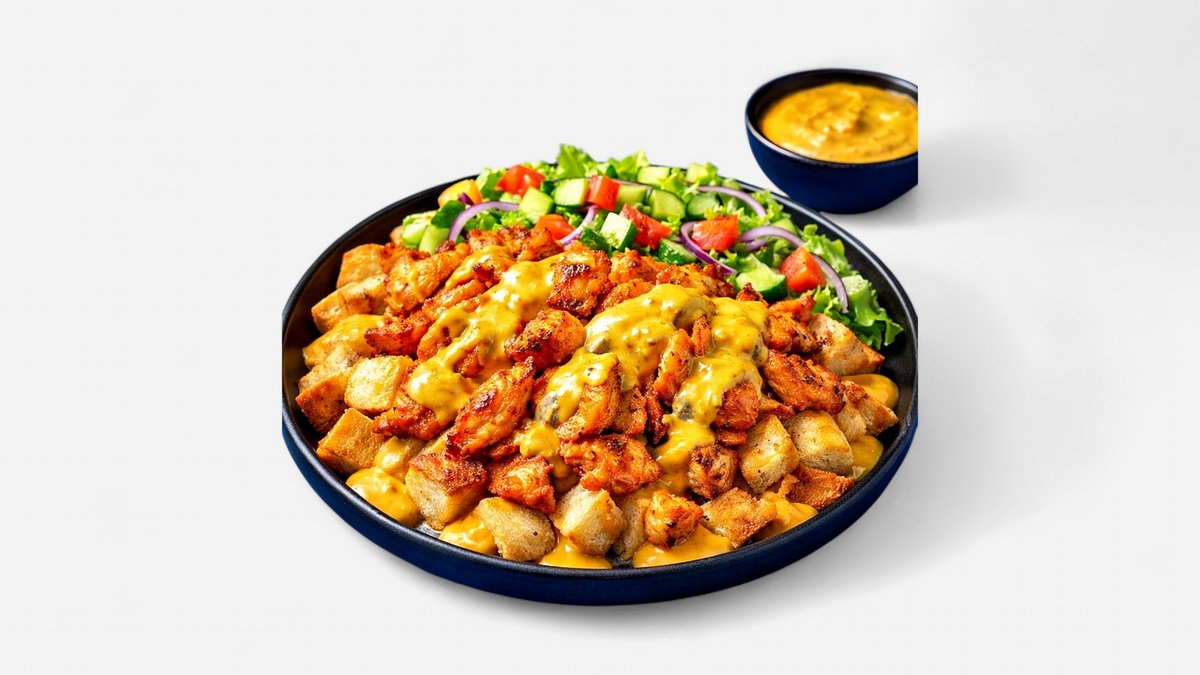 Mehevä kanakebab leipäkuutioilla, täyteläinen currykastike ja raikas salaatti.