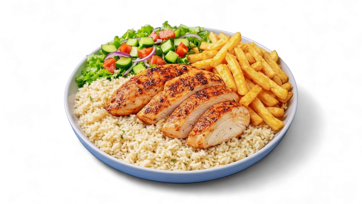 Mehevä kananrintafilee riisillä ja rapeilla ranskalaisilla, raikas salaatti kylkeen