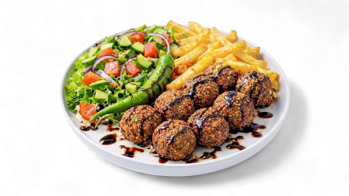 Kuusi rapeaa ja mausteista falafelia tarjoiltuna ranskalaisten, tuoreen salaatin, tomaatin ja vihreän chilin kanssa. Annos viimeistellään raikkaalla balsamico-kastikkeella – herkullinen ja täyttävä kasviselämys!