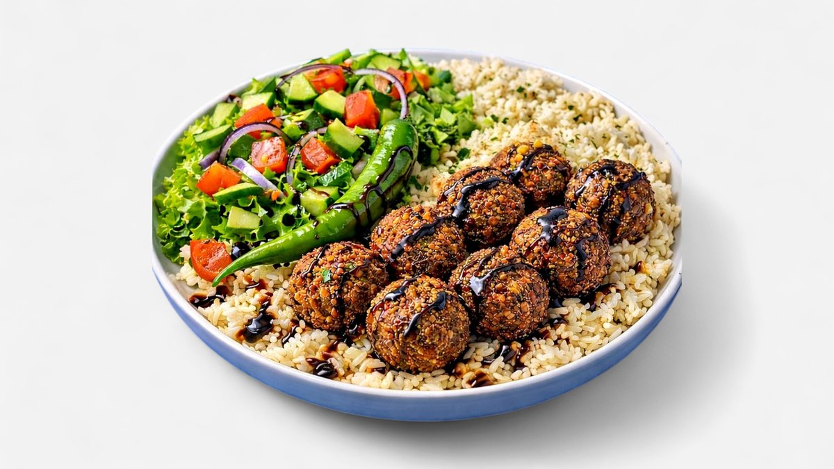Lämmin annos, jossa seitsemän rapeaa falafelia tarjoillaan höyryävän riisin ja tuoreen vihersalaatin kera. Makean ja syvän balsamico-kastikkeen aromi viimeistelee makuelämyksen.