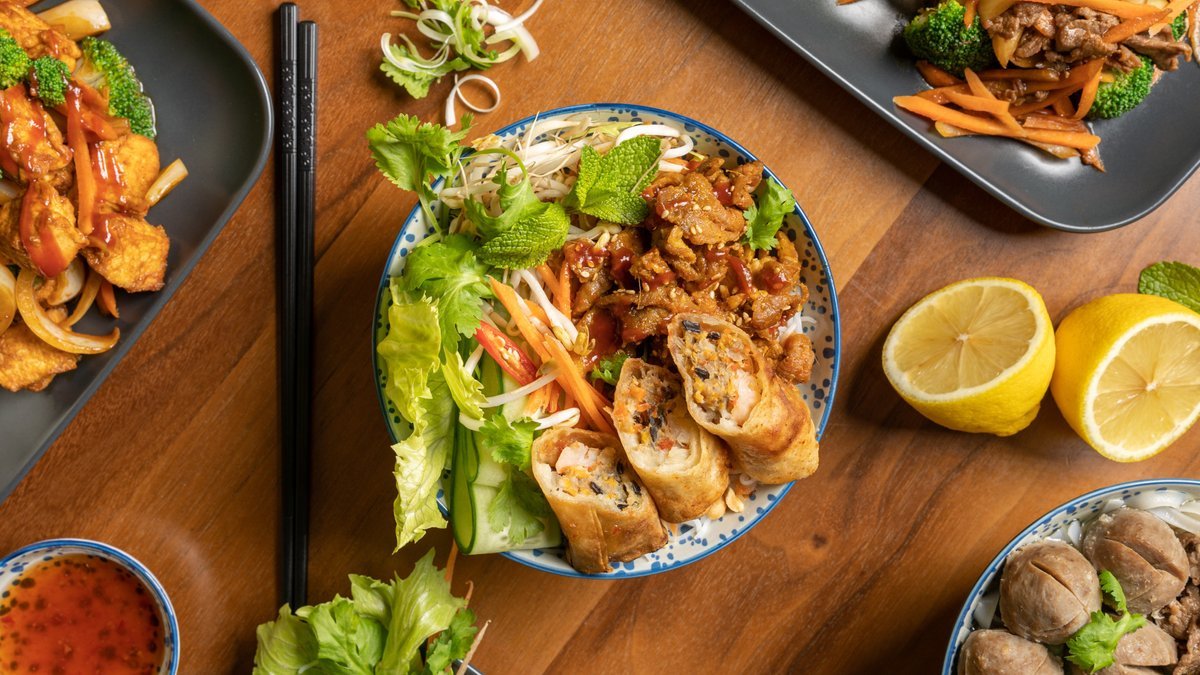 Signature. Grilled pork, prawn and pork springrolls, vermicelli, letture, bean sprouts, cucumber, carrot, dried shallot, peanuts, coriander sweet and sour fish sauce