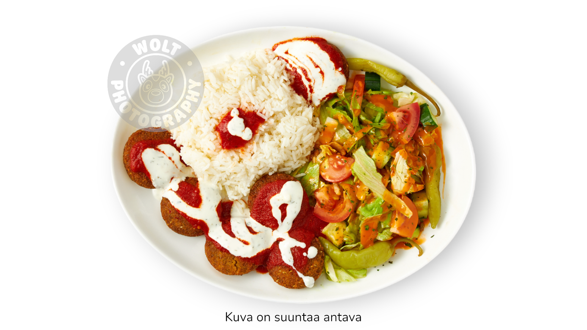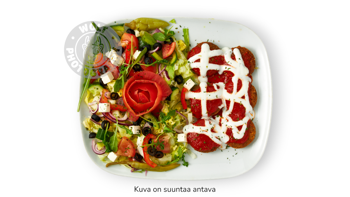 Kaikkiin annoksiin kuuluu jäävuorisalaatti, kurkku, tomaatti, sumaki-sipuli, marinoitu punakaali, fetamuruja, yrtti-jogurttikastike, talon punainen kastike.