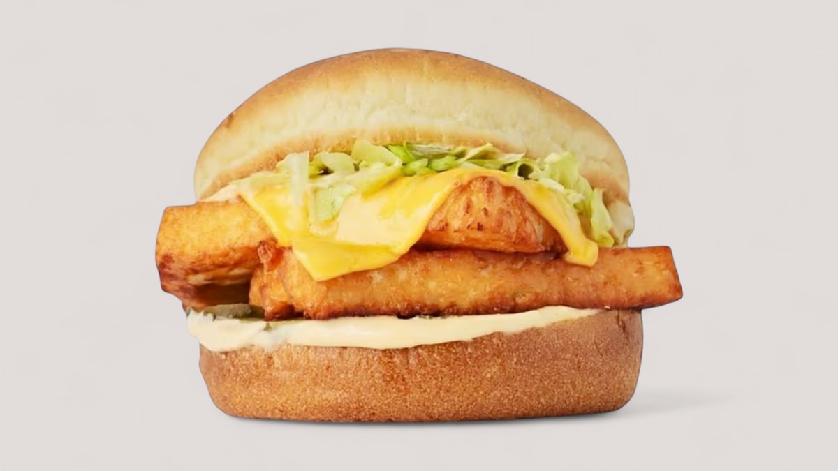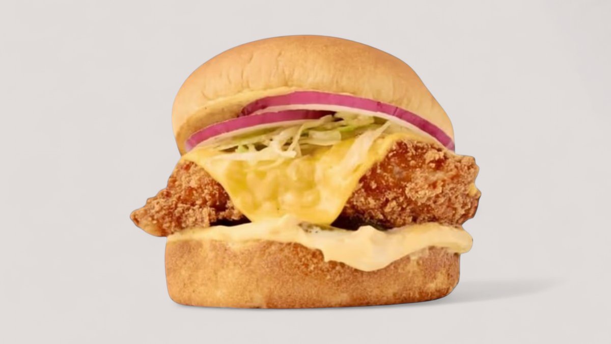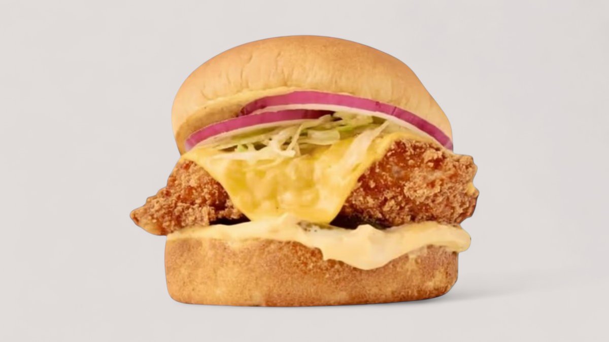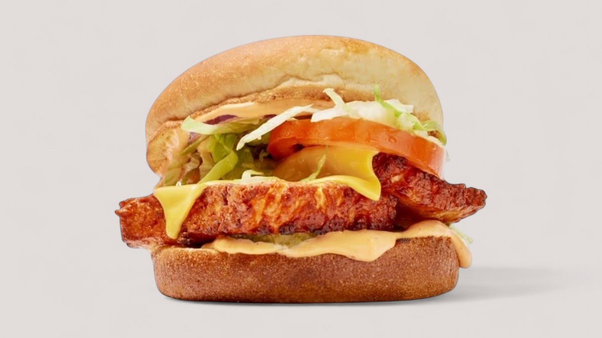 120g breaded chicken breast,cheddar cheese,spicy hot majo, pickle ,tomato and lettuce