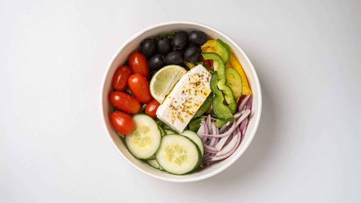 Raikas ja kevyt salaatti, jossa on kurkkua, tomaattia, paprikaa, oliiveja ja murennettua fetajuustoa. Viimeistelty ekstra-neitsytoliiviöljyllä ja yrteillä.