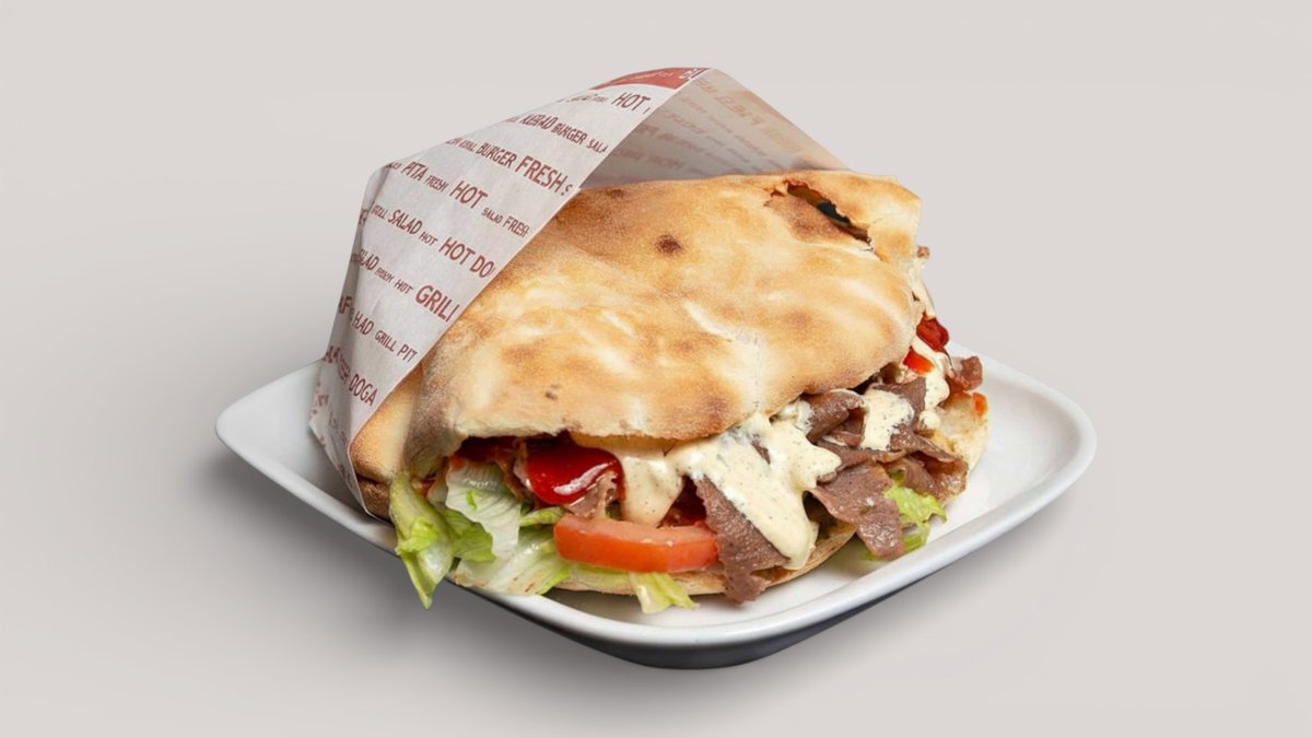 pita leipä, naudanliha kebab, tomaattia, kurkkua, jääsalaattia, punasipulia, kebabkastiketta, salaattikastketta