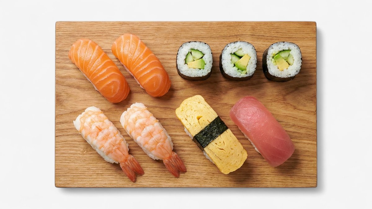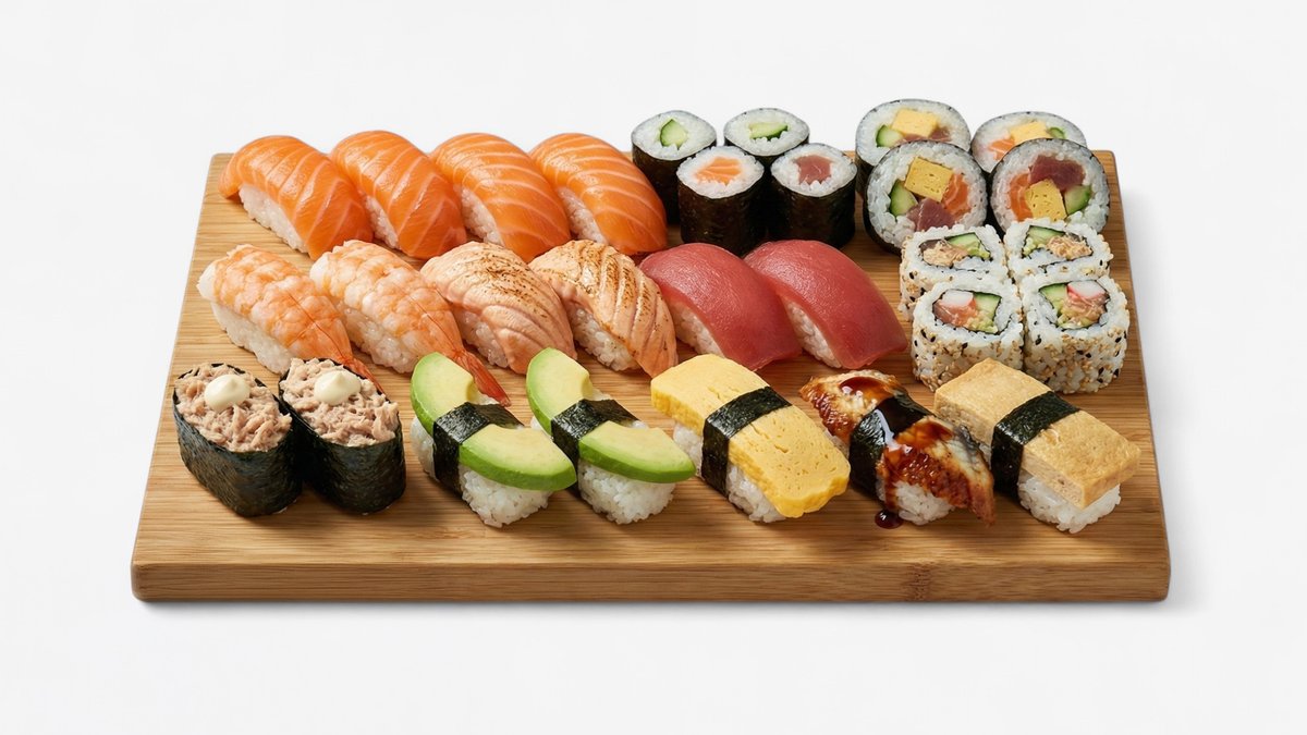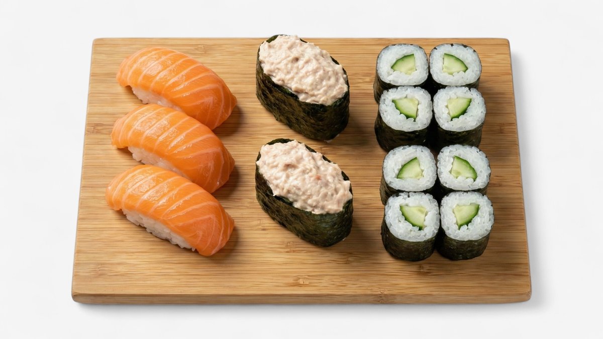 2 x lohinigiri, 2 x katkarapu, 2 x ankerias, 2 x tsuna tonnikala, 2 x grillattu lohi, 2 x kananmuna, 2 x avokado, 2 x tofu, 10 x kappamaki, 14 x californiamaki, 4 x futomaki