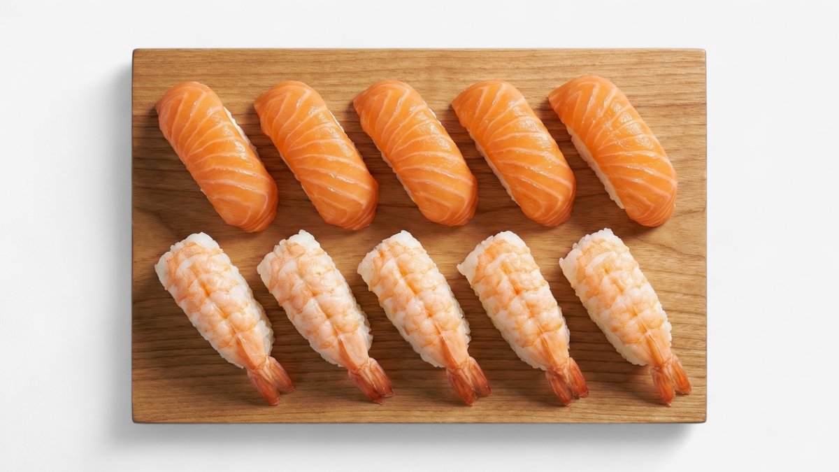 5 x lohinigiri, 3 x katkarapu, 2 x kananmuna, 2 x ankerias, 4 x tsunatonnikala, 1 x tonnikala, 1 x avokado, 1 x tofu, 12 x kappamaki