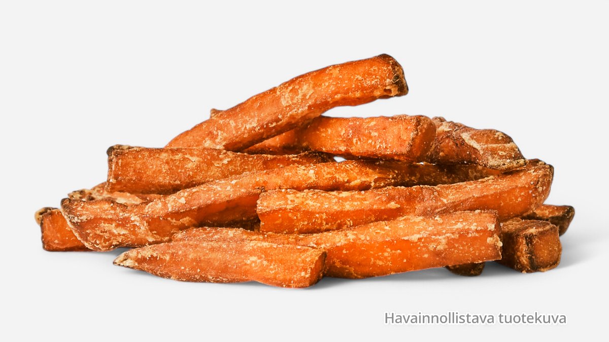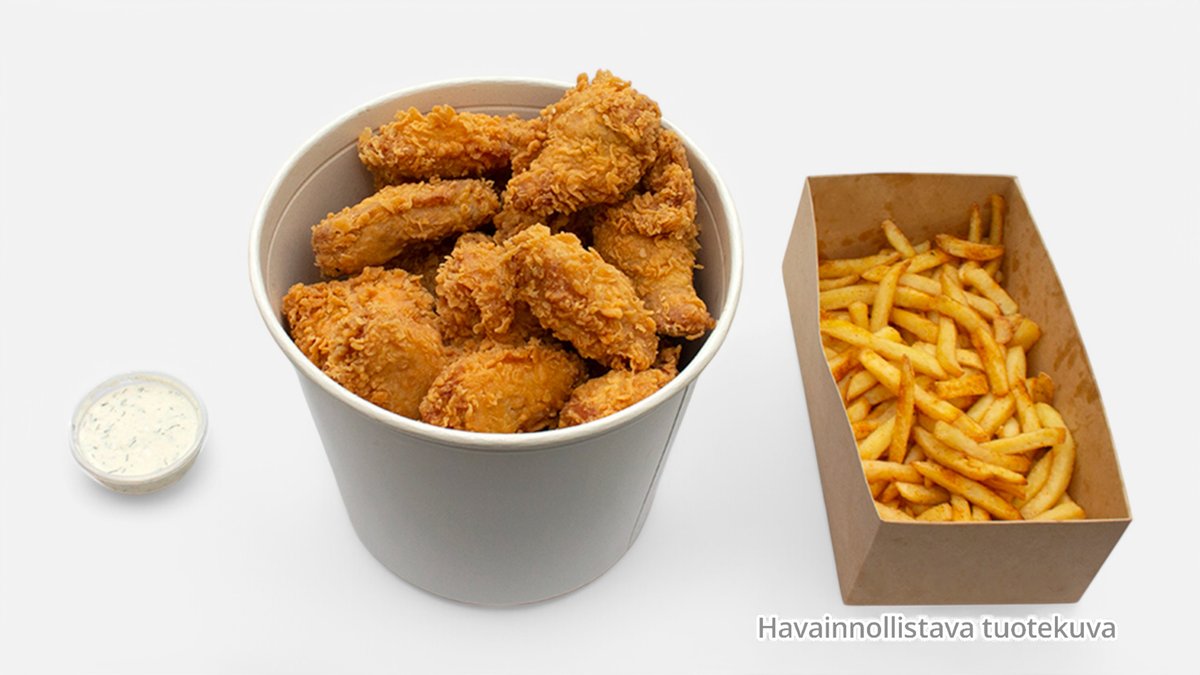 Friteeratut kananpalat, currymajoneesi ja ranskalaiset perunat. (ei ole panerointi)