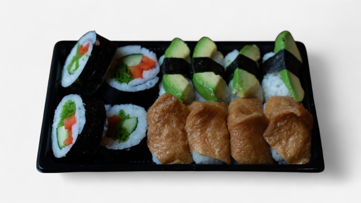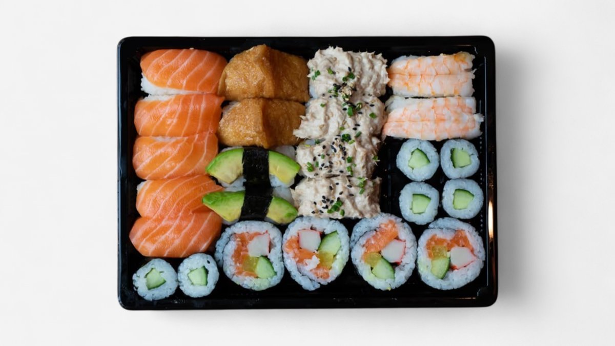 6 kpl kappamaki, 4 kpl futomaki, 5 lohi nigiri, 4 tonnikalamajoneesi nigiri, 2 inari nigiri, 2 ebi nigiri. 2 avokado nigiri