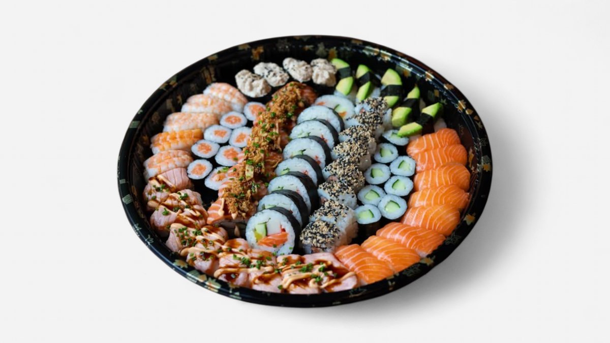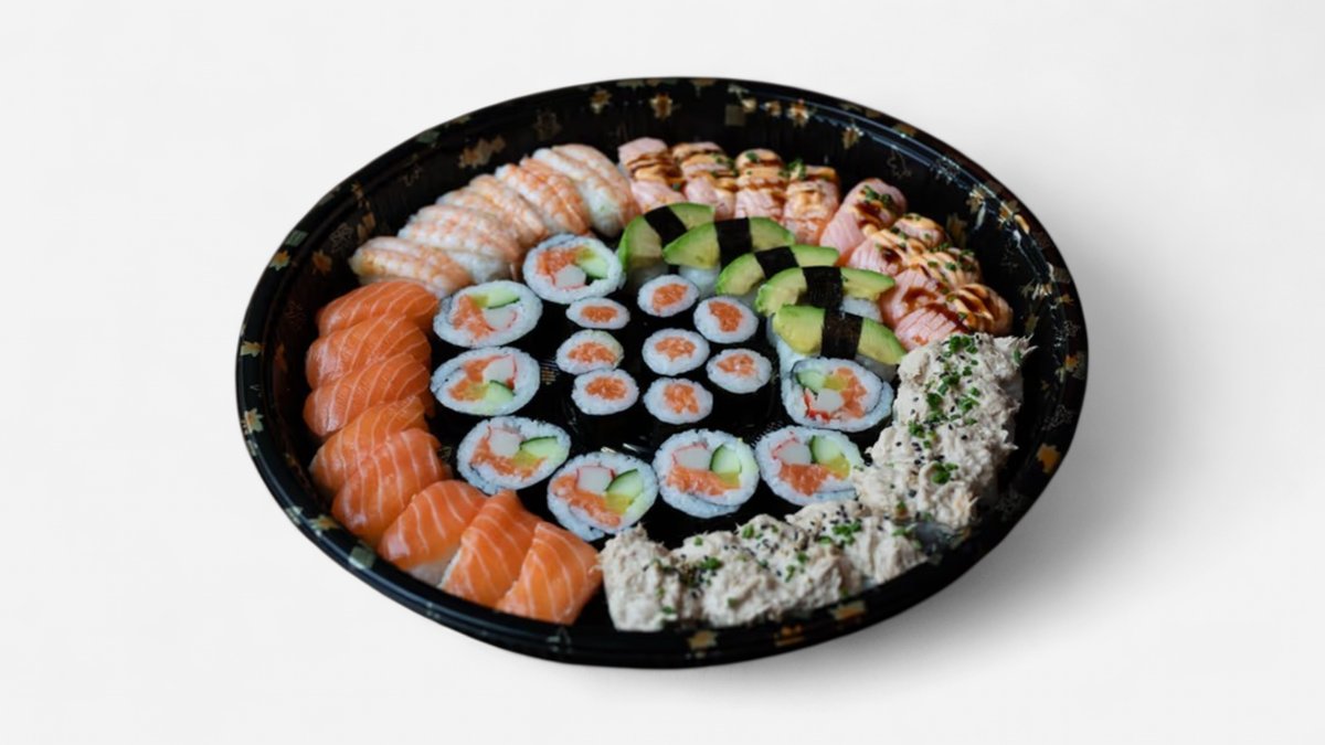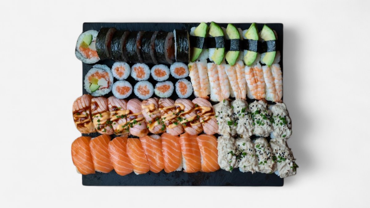 8 kpl lohi nigiri, 8 kpl grillattu lohinigiri, 5 kpl avocadonigiri, 5 kpl katkarapunigiri, 4 kpl tonnikalamajoonesinigiri, 8 kpl futomaki, 8 kpl uramaki, 8 kpl yakimaki, 8 kpl hosomaki kurkkulla, 8 kpl hosomaki lohella