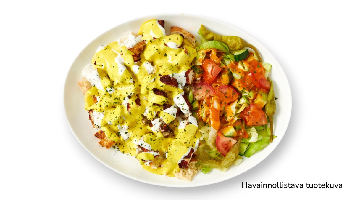 Kaikkiin annoksiin sisältyy: tomaatti, salaatti, maustekurkku, punasipuli, marinoitu punakaalisalaatti , salaattikastike, jogurttikastike.