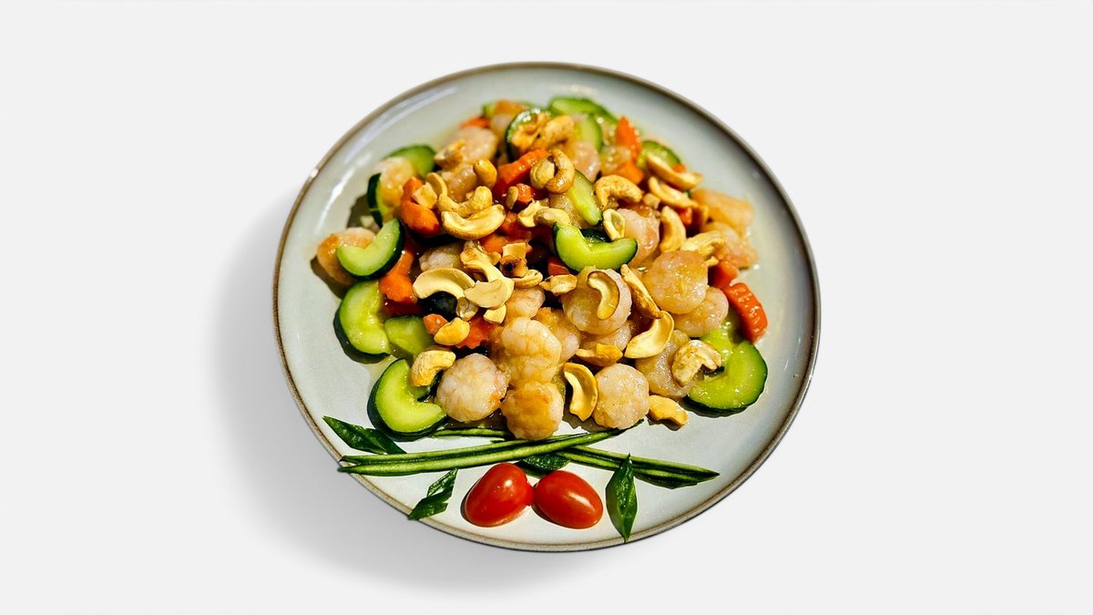 Prawns quickly cooked until perfectly tender and stir-fried paired with crunchy cashews, mixed with bell peppers, carrots, and celery. Served with rice.
