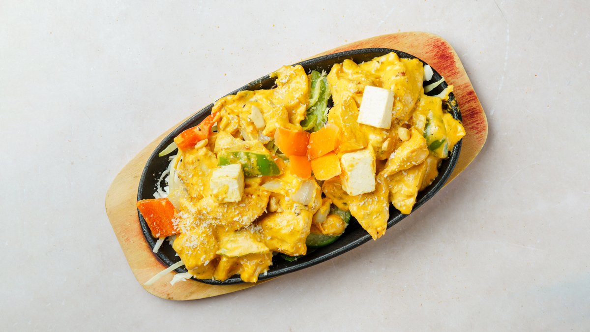 Paistettua tuorejuustoa inkivääri sipuli tomaatti paprika curry kastikkeessa.