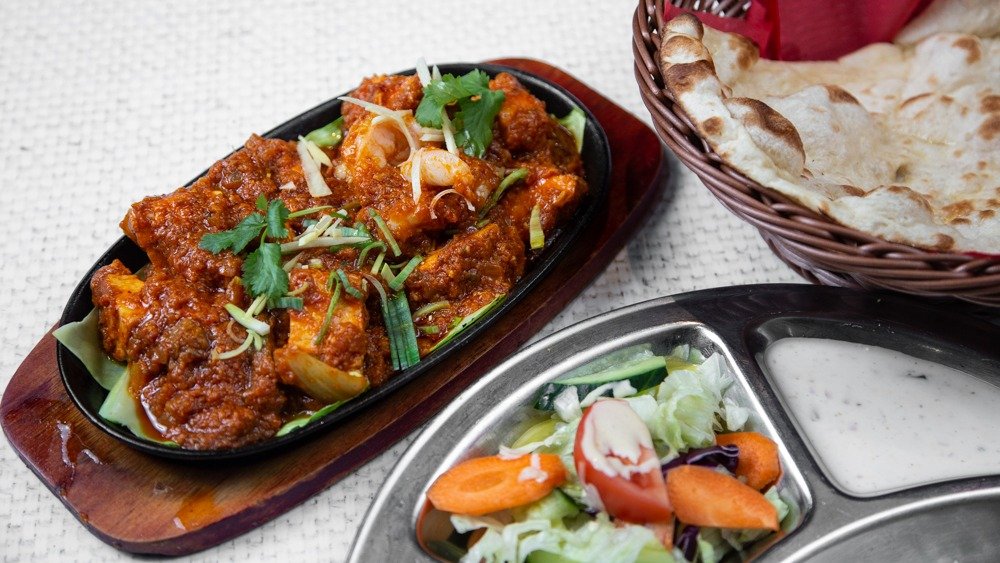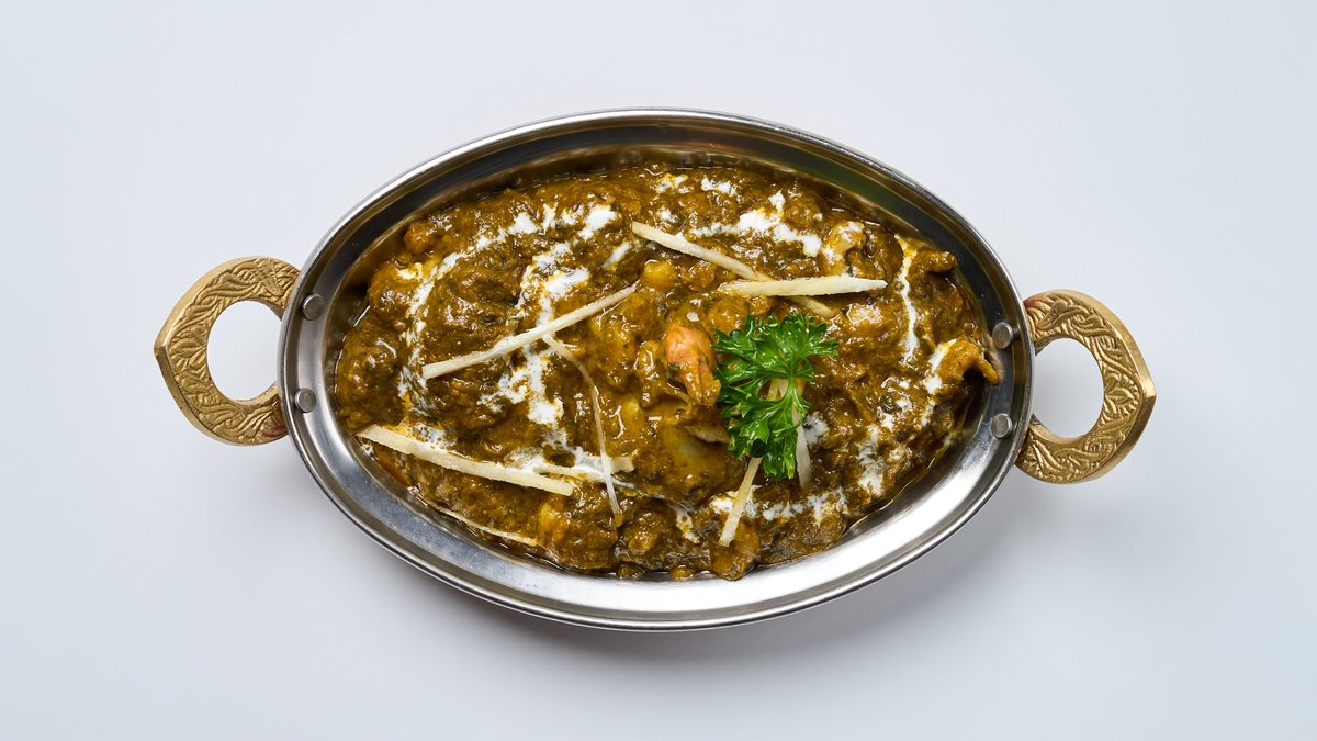 Tandooriuunissa paistettu lampaan sisäfileetä, grillattua kanaa, jättikatkarapuja, tuorejuustoa ja cashewpähkinää valkosipuli-pinaatti-curry-kermakastikkeessa