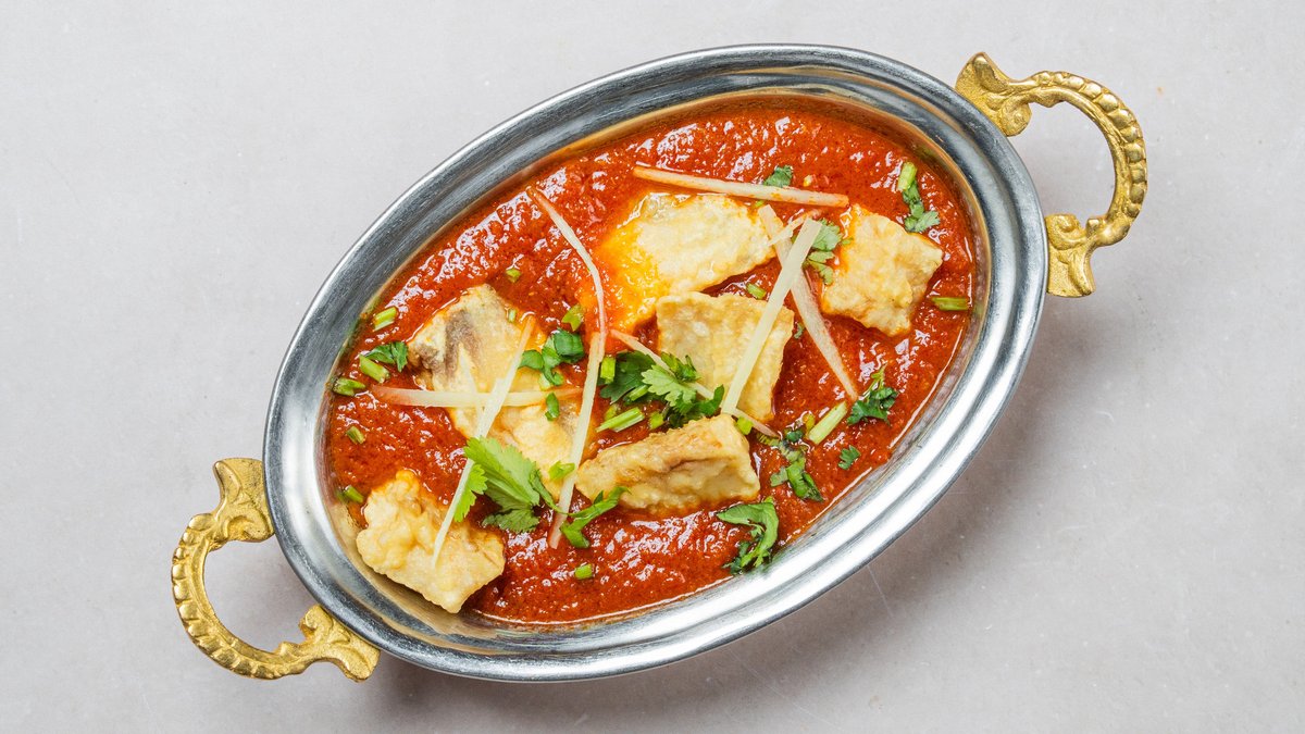 Friteerattu tilapia, sipuli-valkosipuli korianteri, inkivääri tomaatti currykastikkeessa. Deep fried fish onion-garlic coriander, ginger in tomato curry sauce.