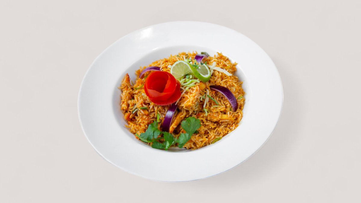 Paistettua Basmati risiàrisottona, tandoori kanaa, lampaan paloja, jättikatkarapu ja cashewpähkinää, raita kastikkeen kera. Fried Basmati rice as risotto,tandoorichicken, lamb, king prawns and cashew nuts, served with raita sauce.