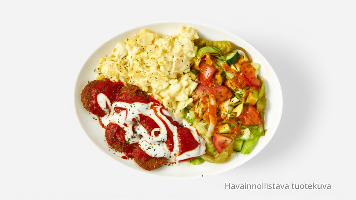 Kaikki falafel annokset sis. jäävuorisalaatti, tomaatti, kurkku, vihreä chili ja jogurttikastike