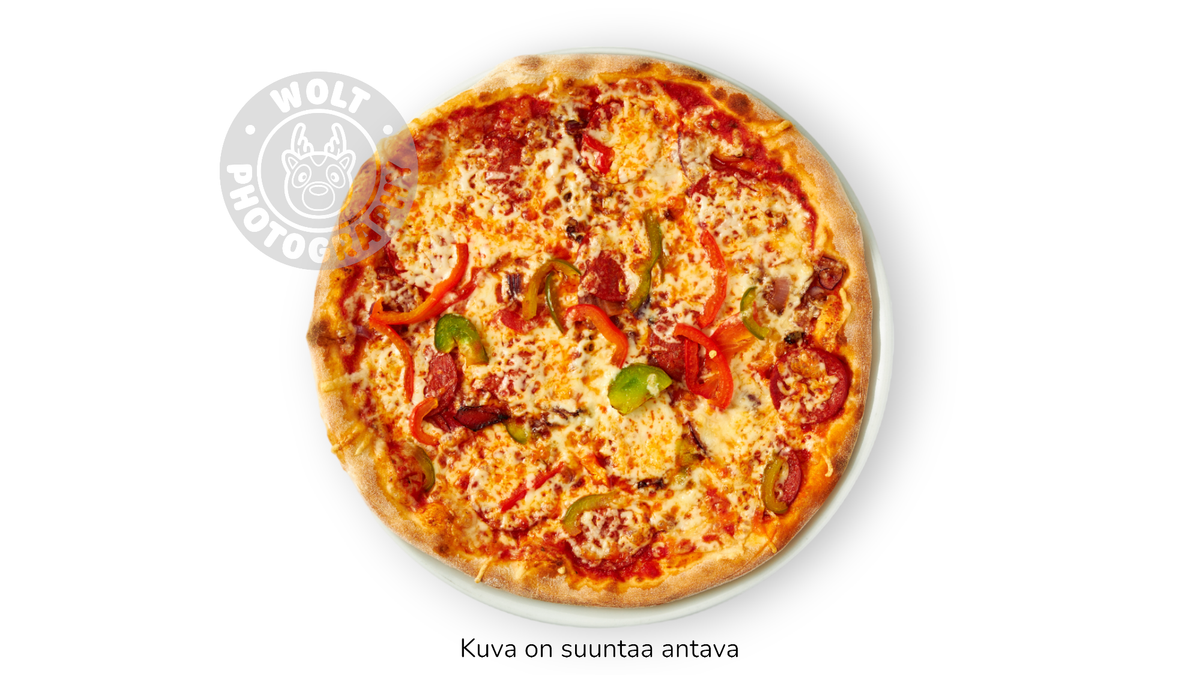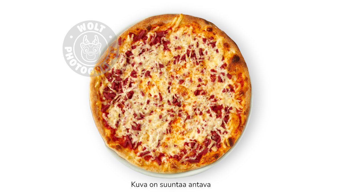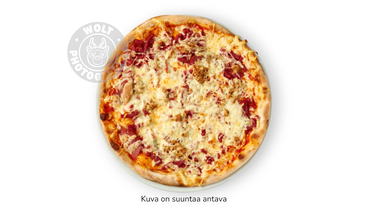 Kinkku, salami, sipuli, katkarapu tuplajuusto, mustapippuri, valkosipuli