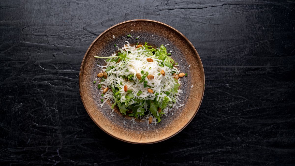 Vihersalaattimix, sitrusvinaigrettea, parmesanjuustoa ja kurpitsansiemeniä