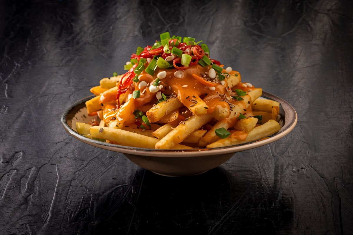 Täyteläinen gochujang-kastike, tuorejuustodressingiä, kevätsipulia, kimchi-seesamia ja pikkelöityä tuorekurkkua