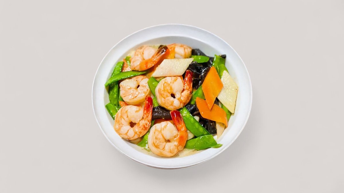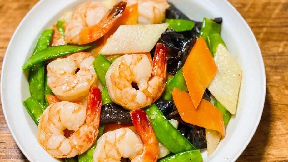 Wokissa paistettuja katkarapuja ja kauden kasviksia虾仁炒时蔬 ja riisi