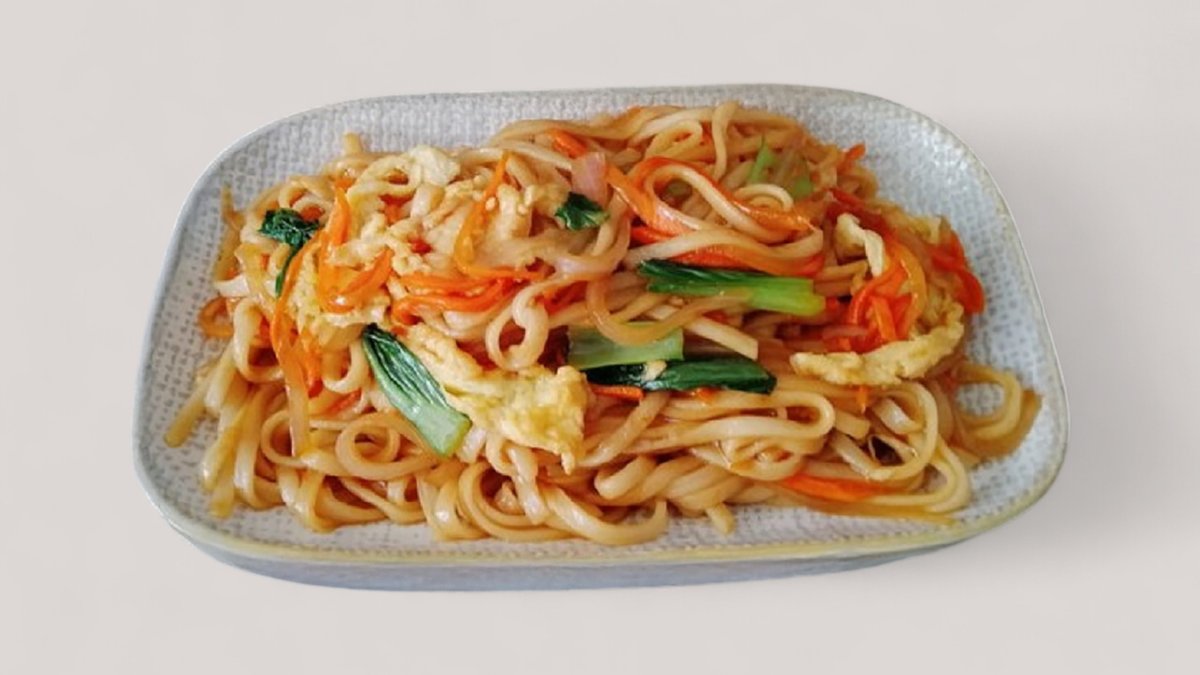 Runsas annos paistettuja nuudeleita kasviksilla. Sis. kananmunaa. Ruokajuomina