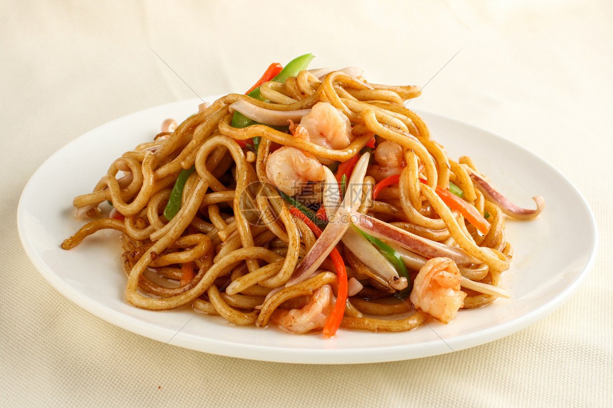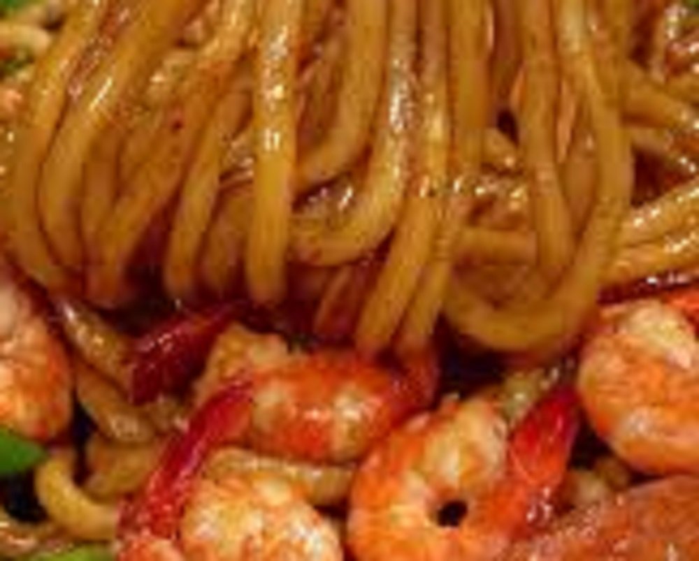 Paistetut Udon-nuudelit katkaravuilla ja kasviksilla虾仁蔬菜炒乌冬