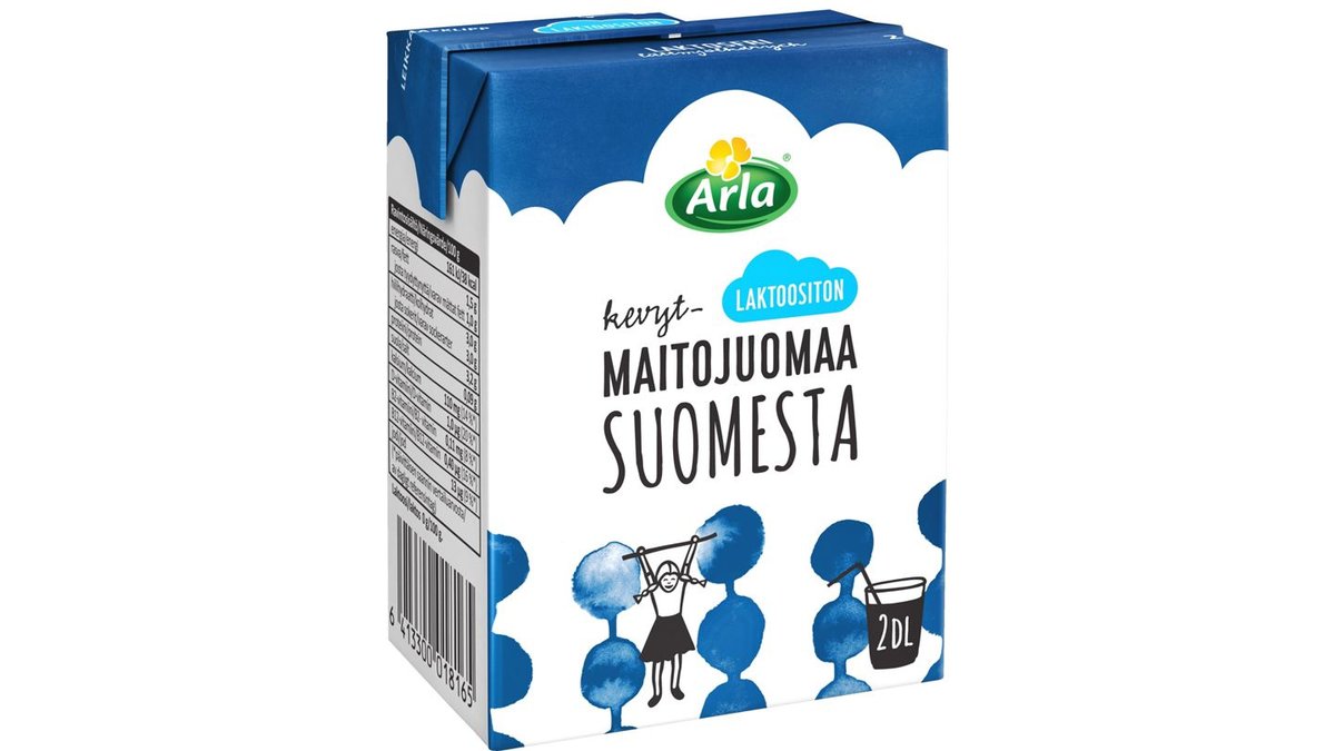 Arla Laktoositonta kevytmaitojuomaa Suomesta (UHT) on valmistettu Suomessa suomalaisesta maidosta. Maitojuoma on monipuolinen ravintoaineiden lähde. Maitojuoma sisältää runsaasti proteiinia ja kalsiumia, jonka imeytymistä parannetaan lisäämällä maitojuomaan D-vitamiinia. Rasvaa 1,5 %. Kätevä annospakkaus säilyy avaamattomana huoneenlämmössä ja pakkauksessa on mukana pilli.