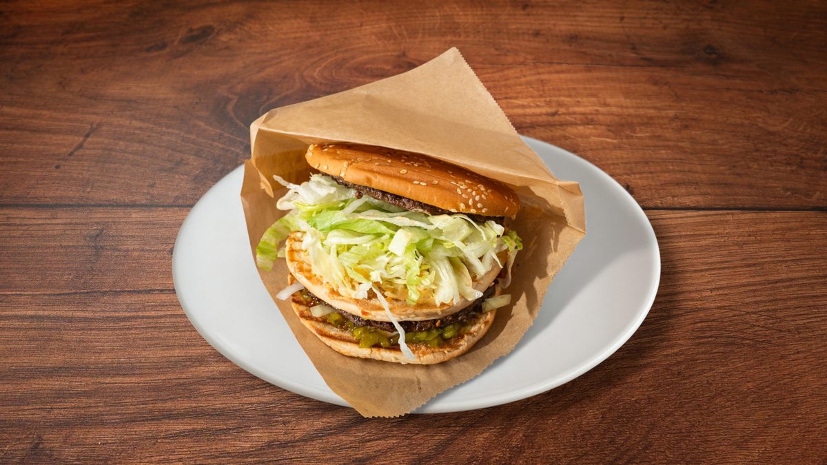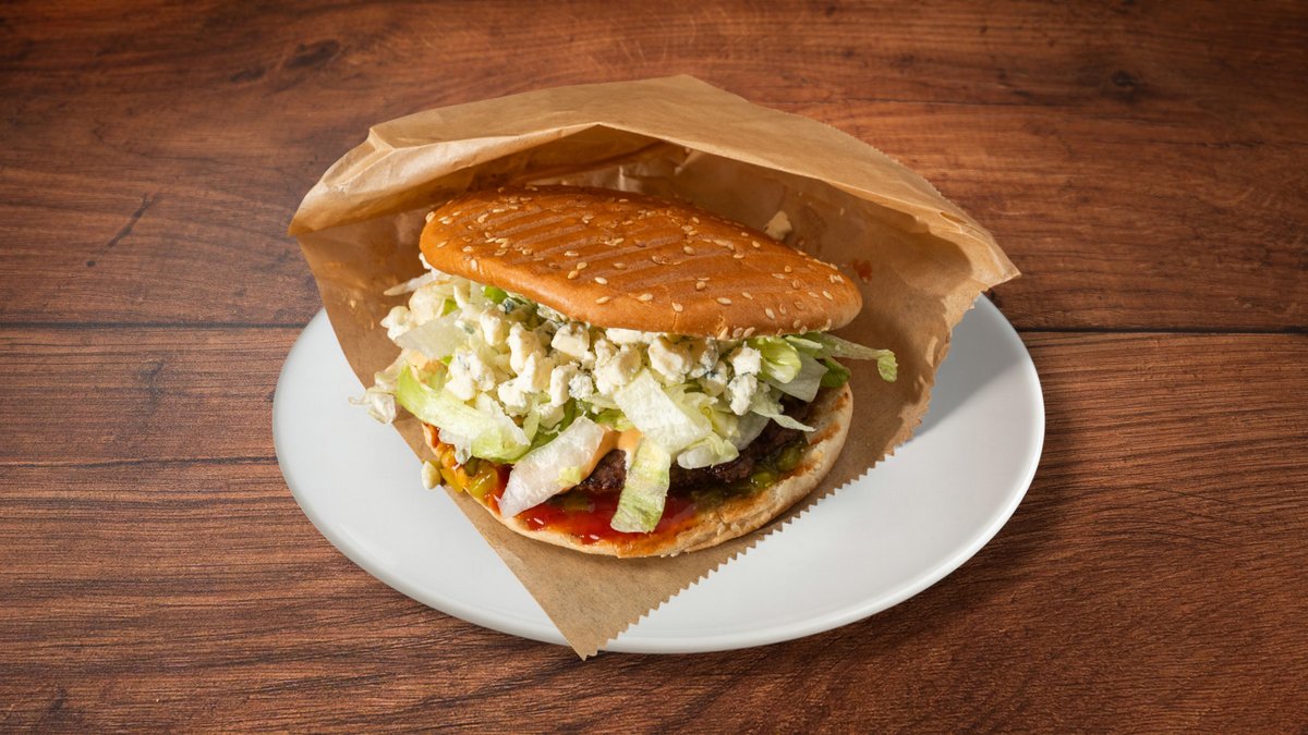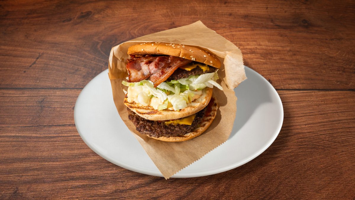 Pihvi (2x120 g), cheddar (2x), pekoni (2x), valitsemasi mausteet