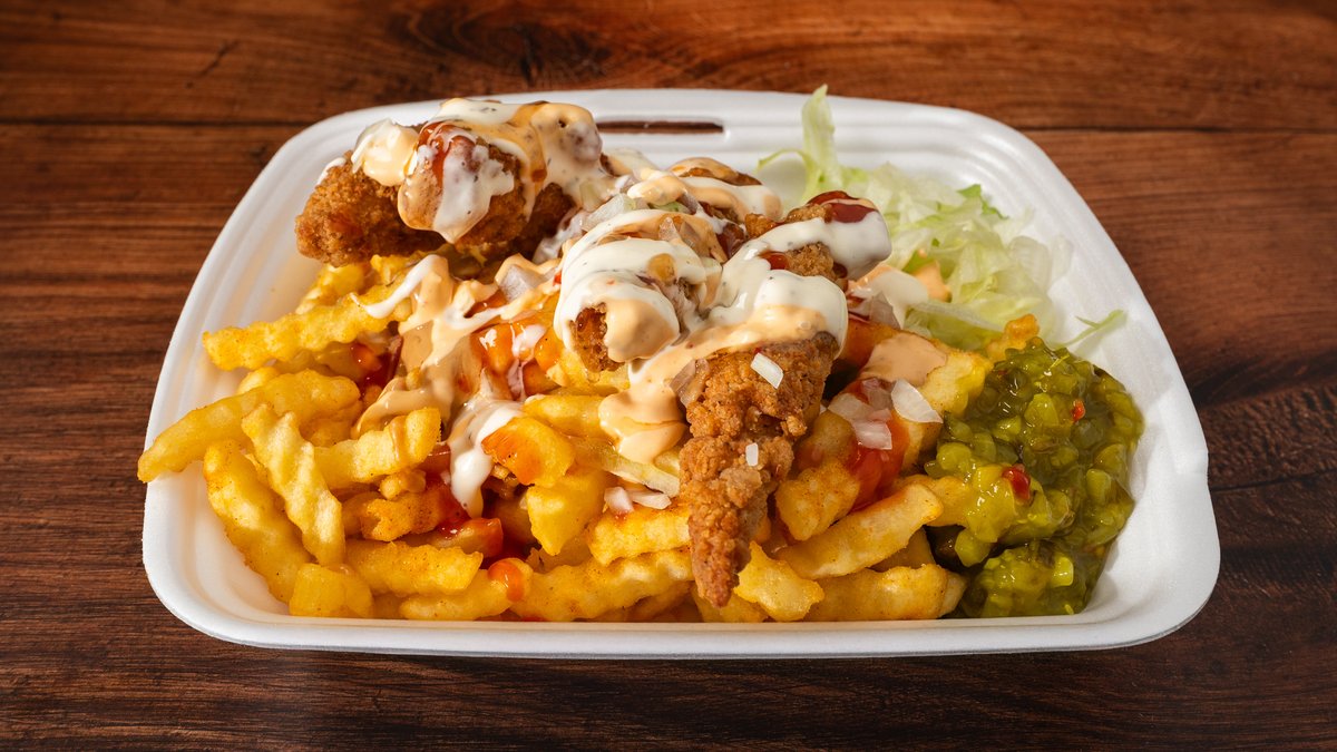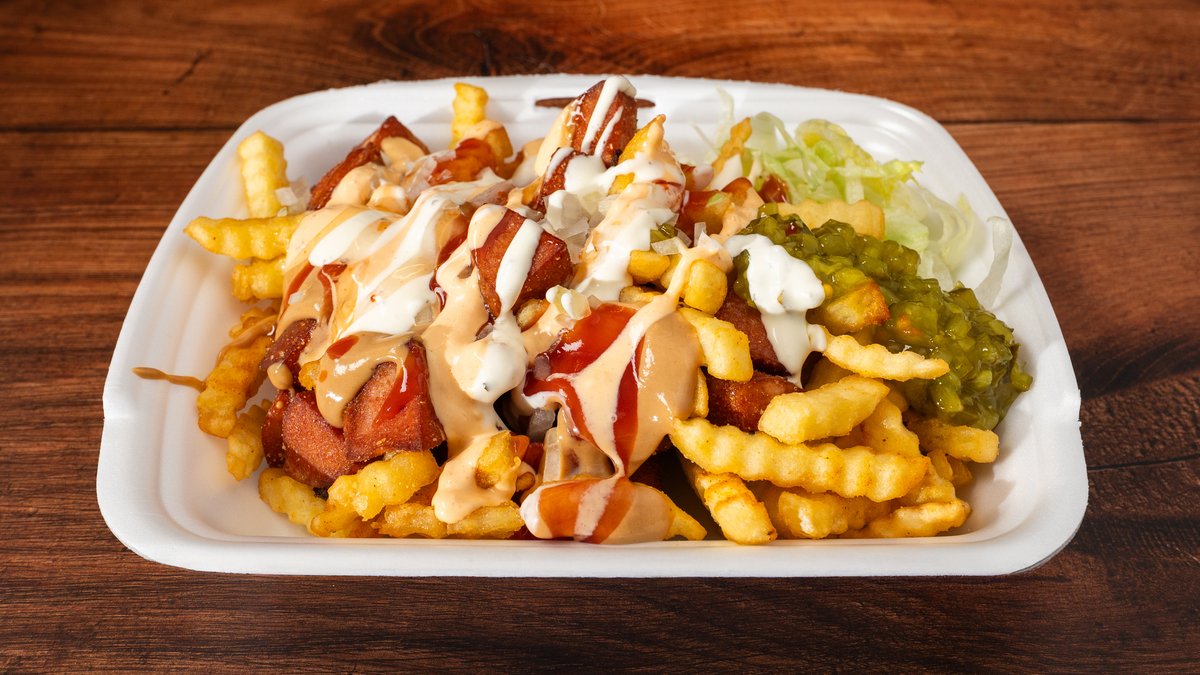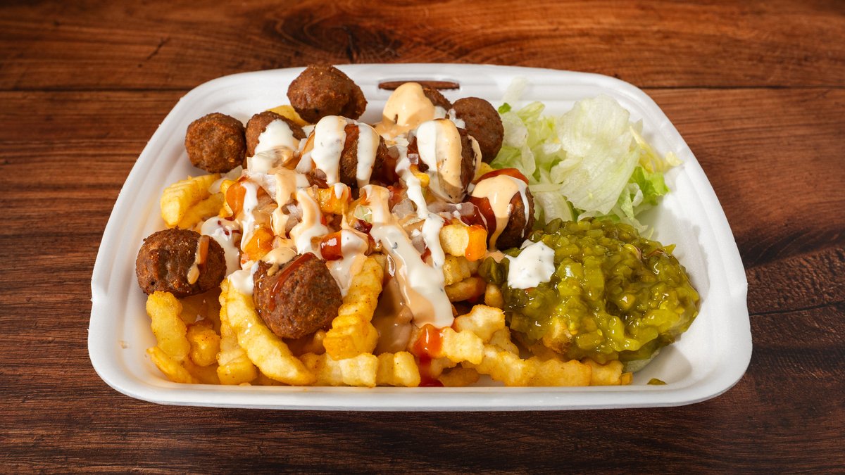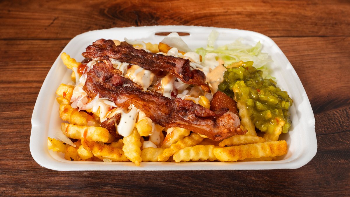 Makkara, lihapulla, pekoni, juustoraaste, pippurikastike, ranskalaiset