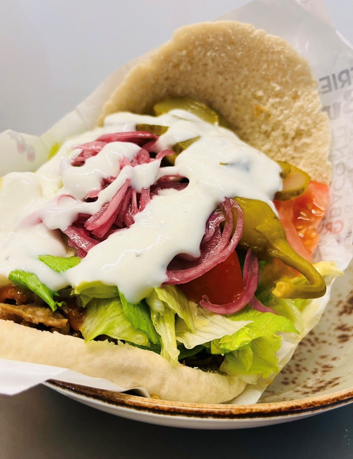 Pitaleipä, jonka sisällä herkullista kebab lihaa ja salaattia (jäävuorisalaatti, tomaatti, kurkku ja pepperonipaprika), sekä kastikkeita oman valintasi mukaan.